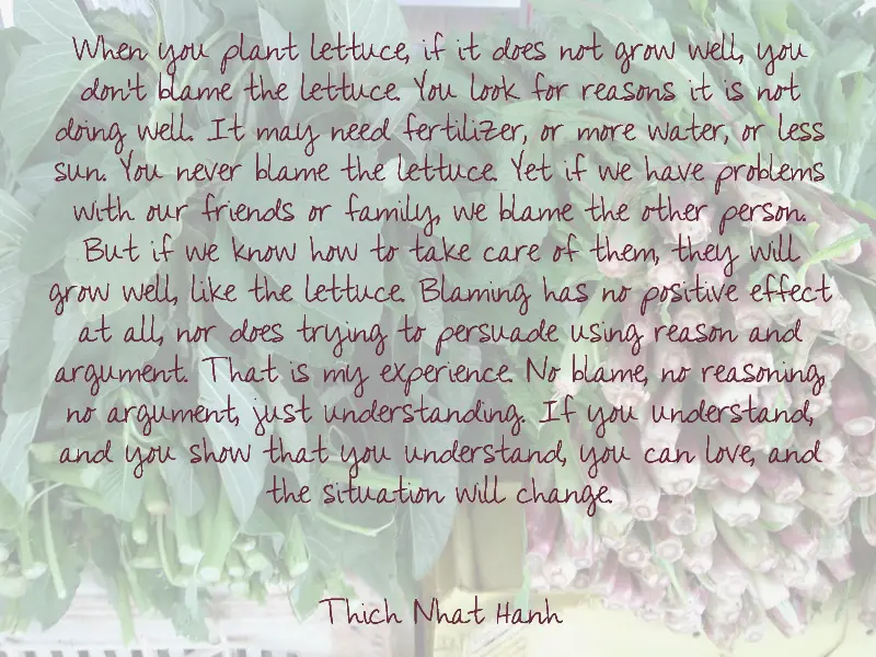 When you plant lettuce, if it does not grow well, you don’t blame the lettuce. You look for reasons it is not doing well. It may need fertilizer, or more water, or less sun. You never blame the lettuce. Yet if we have problems with our friends or family, we blame the other person. But if we know how to take care of them, they will grow well, like the lettuce. Blaming has no positive effect at all, nor does trying to persuade using reason and argument. That is my experience. No blame, no reasoning, no argument, just understanding. If you understand, and you show that you understand, you can love, and the situation will change.
