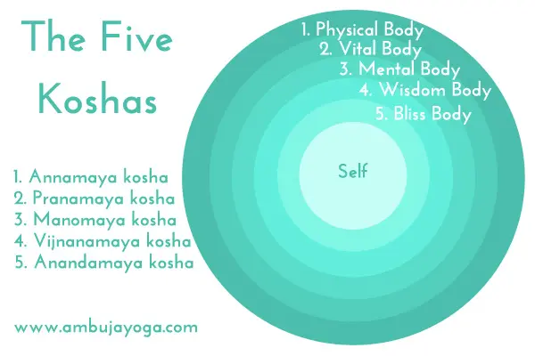 1. Annamaya kosha (the physical body) 2. Pranamaya kosha (the energy or vital body) 3. Manomaya kosha (the mental body) 4. Vijnanamaya kosha (the wisdom body) 5. Anandamaya kosha (the bliss body)